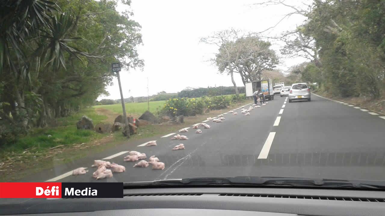 Scène insolite mardi 8 novembre sur la route Royale à Beau-Vallon, Mahébourg, où des poulets entiers sont tombés d’un camion frigorifique.