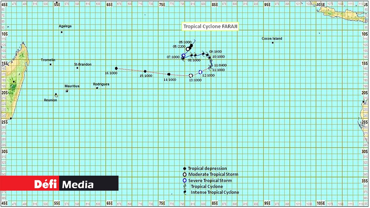 À 10 heures ce matin, Faraji était centré à environ 2 865 km à l'est-nord-est de Maurice à 16,4° de latitude sud et longitude 84,7 degrés est.