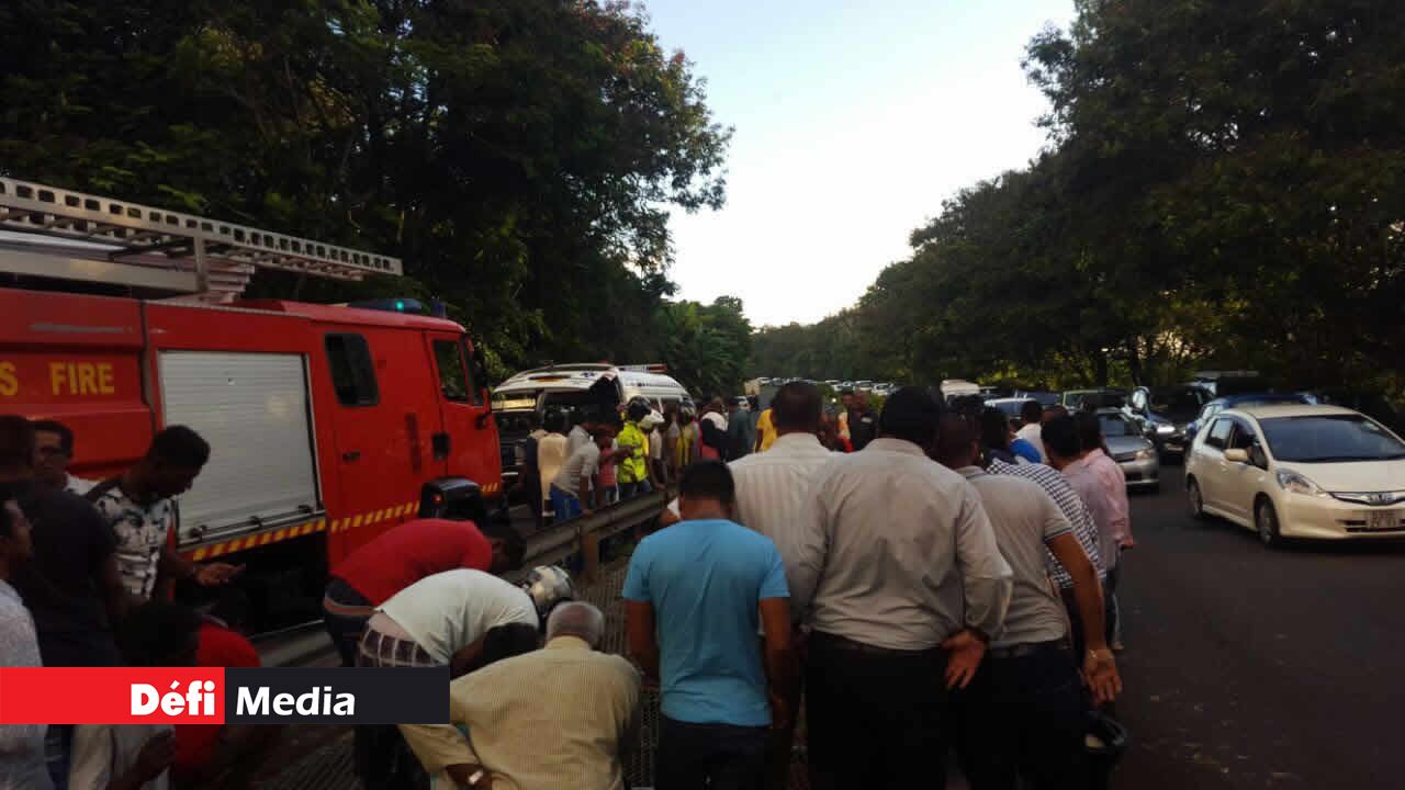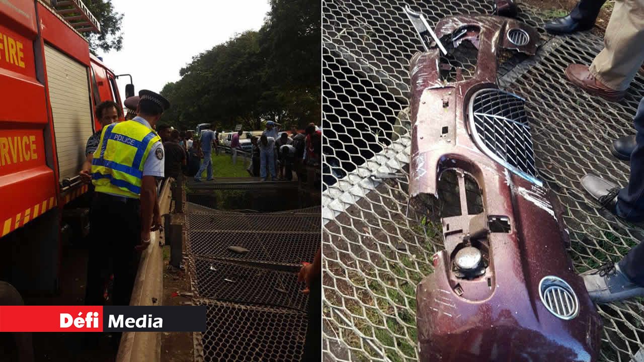 En arrivant à la New Trunk Road, Calebasses, entre le rond-point Beau-Plan et celui de Calebasses, la voiture a fait une violente sortie de route et a percuté un parapet avant de terminer sa course dans un canal se trouvant entre les deux voies de l’autoroute.