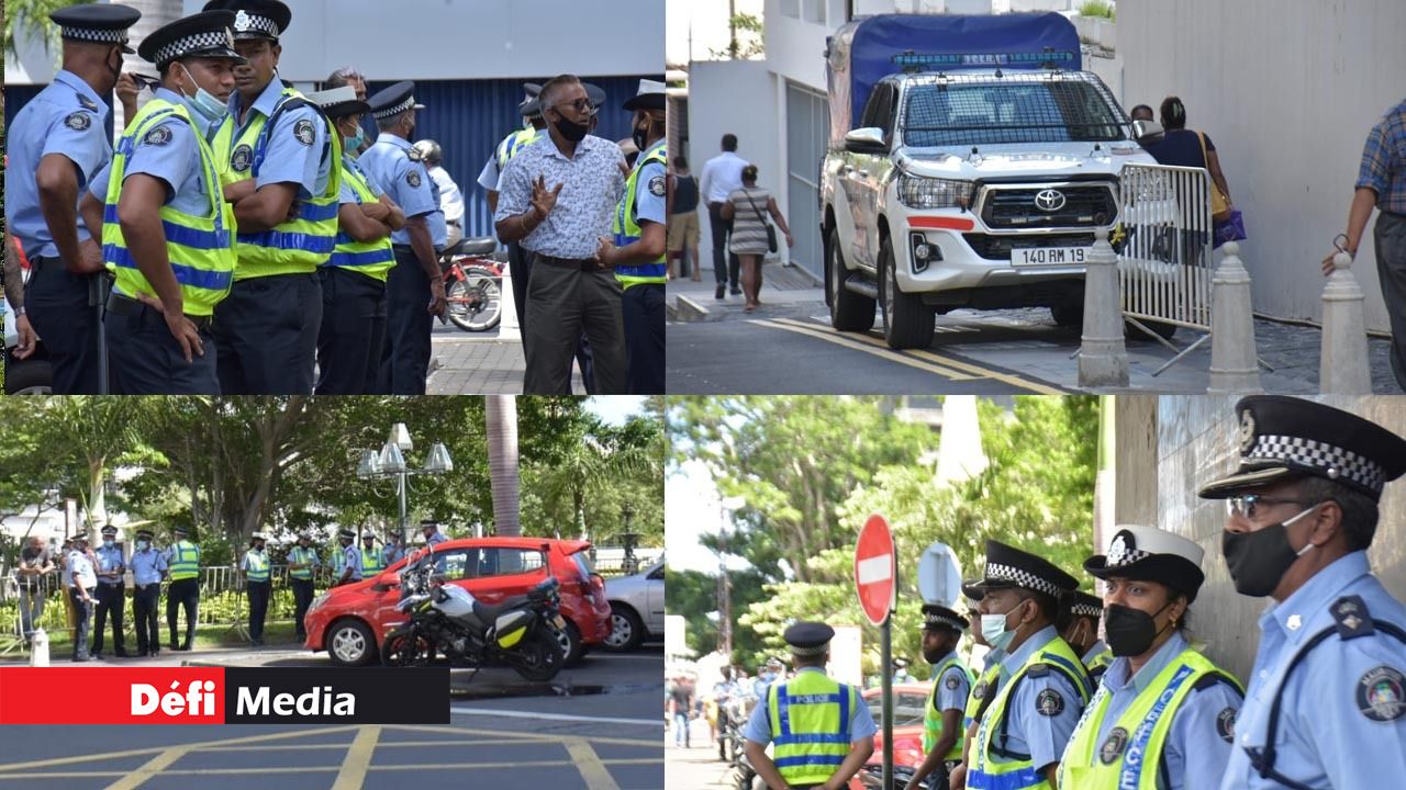 Ils sont postés un peu partout dans les alentours de la Cour afin de veiller qu’il n’y ait aucun dérapage alors que le ministre du Commerce est en train de comparaître à la Cour dans la Private Prosecution intentée contre lui par Simla Kistnen.