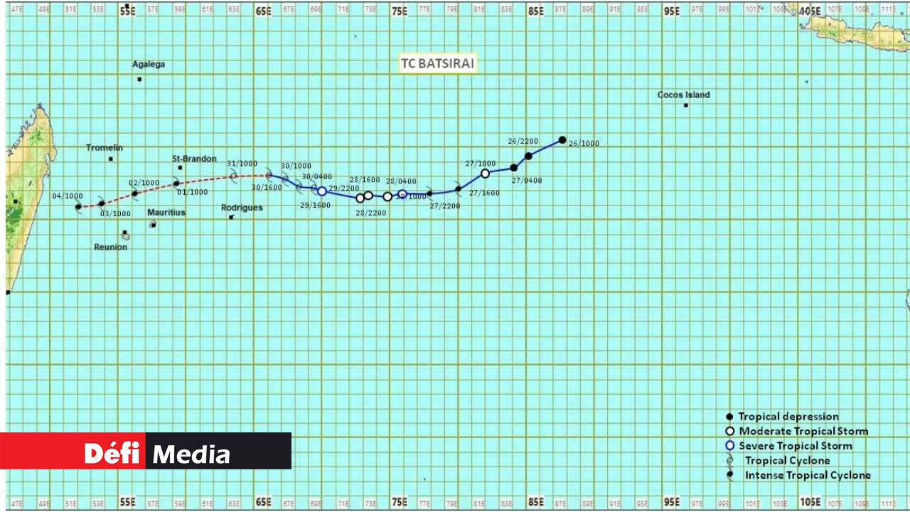 Sur cette trajectoire, le cyclone continue de se rapprocher de Rodrigues. Puisque Batsirai est de petit diamètre, l'île sera en dehors de la zone des vents les plus violents. Néanmoins, un léger infléchissement vers le sud ramènerait son centre plus près de l’île. Et, dans un tel cas de figure, Rodrigues serait l’effet de plus fortes rafales.