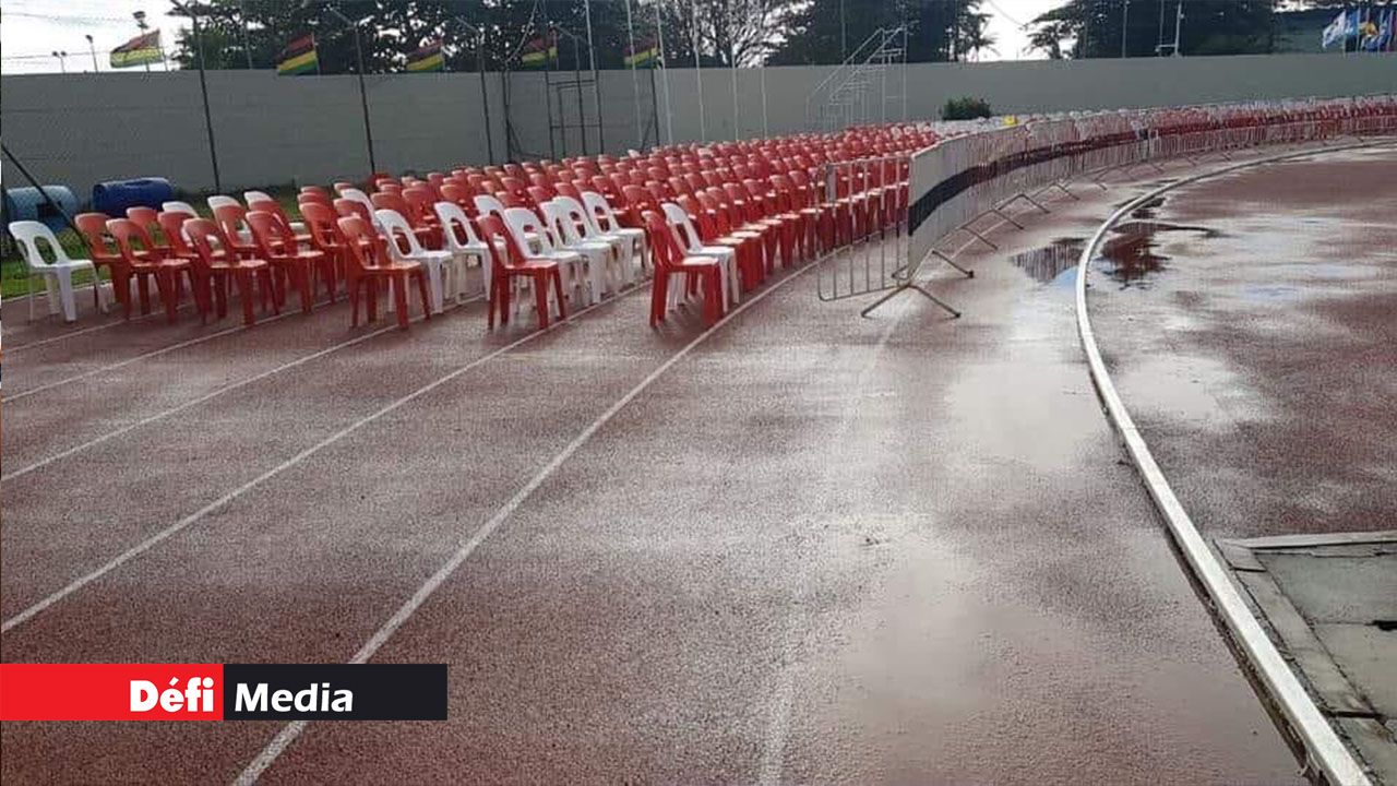 A trois heures du coup d'envoi de la rencontre, l'on s'affairait à installer des chaises sur la piste d'athlétisme du stade comme vous pouvez le constater ci-dessous :