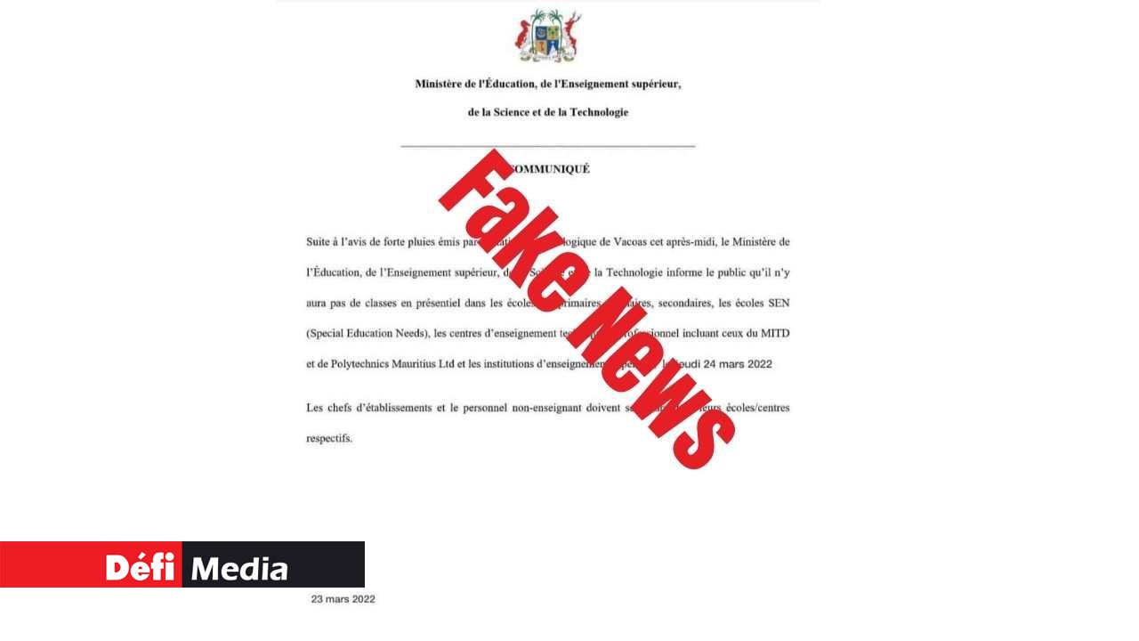 Il se trouve qu'un faux communiqué portant le logo du ministère de l'Éducation et la date d'aujourd'hui fait croire qu'il n'y a pas de classe ce jeudi 24 mars pour tous les établissements scolaires circule sur les réseaux sociaux.