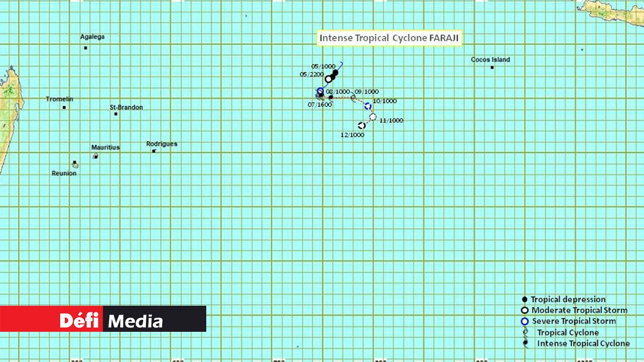 À 16 heures, ce dimanche 7 février, le cyclone tropical intense Faraji était centré vers le point 14,7 ° de latitude sud et 79,9 ° de longitude est, soit à environ 2 400 km à l'est-nord-est de Maurice. Il est quasi-stationnaire. Par conséquent, Faraji n'influencera pas le temps sur notre région, indique la station météo de Vacoas.