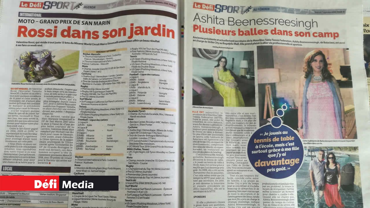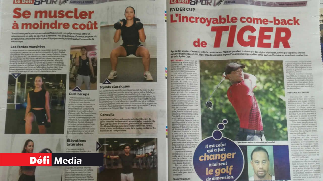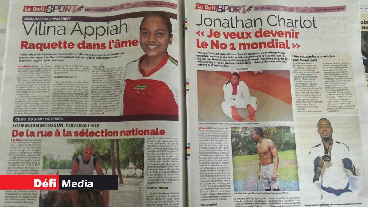 Les pages glamour sont consacrées à la basketteuse mauricienne Kelly Webb et aux sulfureuses surfeuses internationales. Le Maiden tient bien évidemment sa place avec un poster consacré à Enaad, qui a réalisé le doublé dimanche dernier. Le Défi Sport vous conseille aussi quoi manger et comment vous exercer. Sans oublier les portraits des stars d'hier, d'aujourd'hui et de demain : Ashita Beenessreesingh, Bennon Soobiah, Aslum et Moibeen Jeewa, Vilina Appiah, Lookman Moosun, Jonathan Charlot et Robert Chung. International : Rossi dans son jardin à San Marin et la rédemption de Tiger Woods en vue de la Ryder Cup.