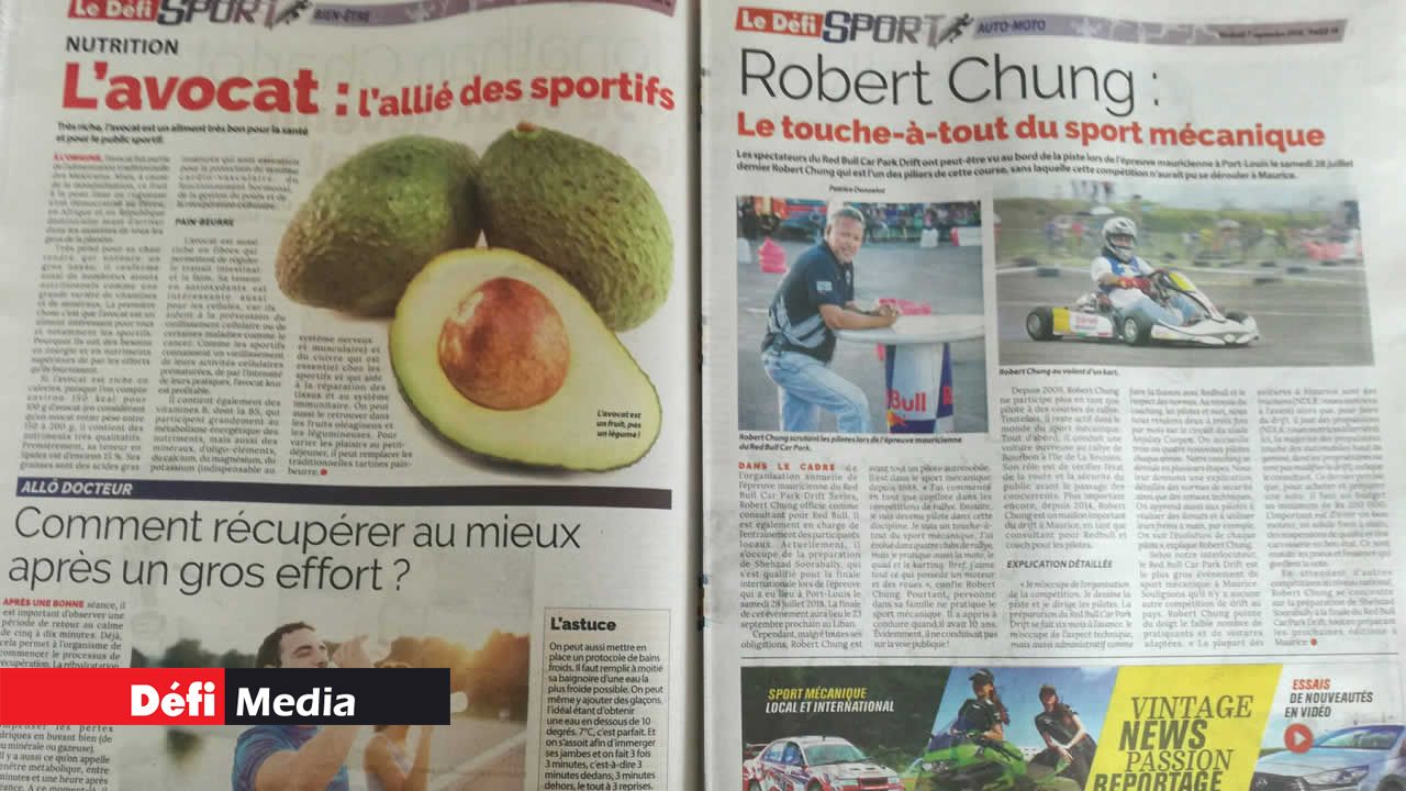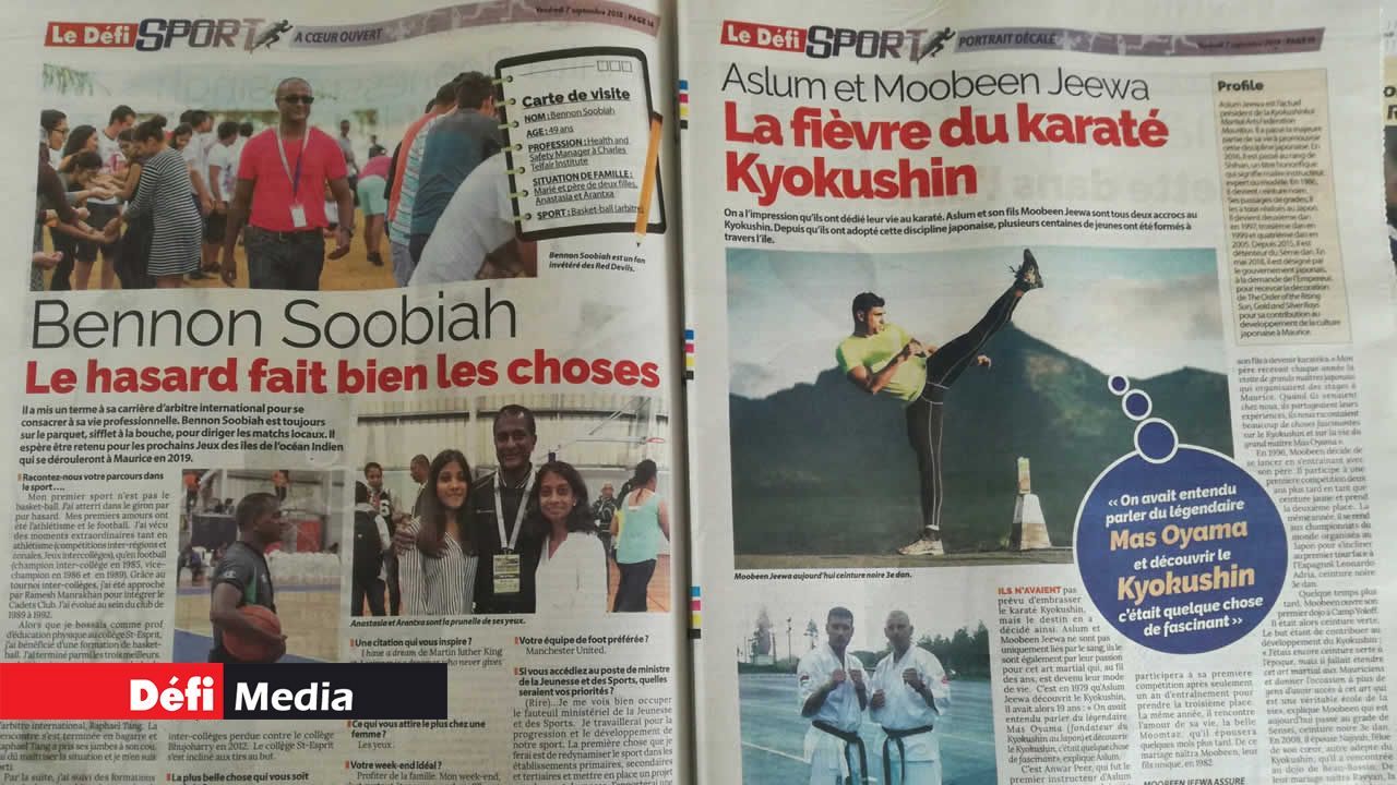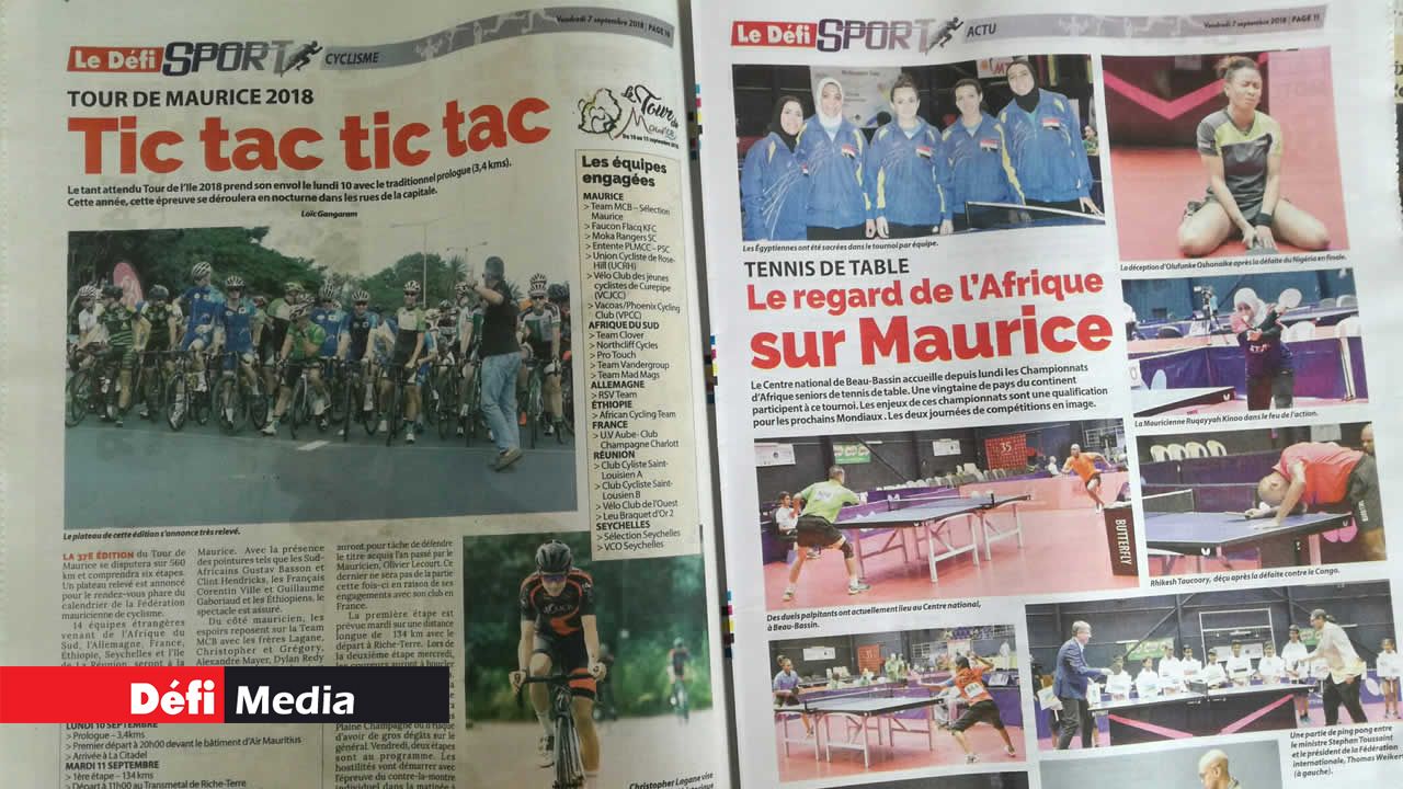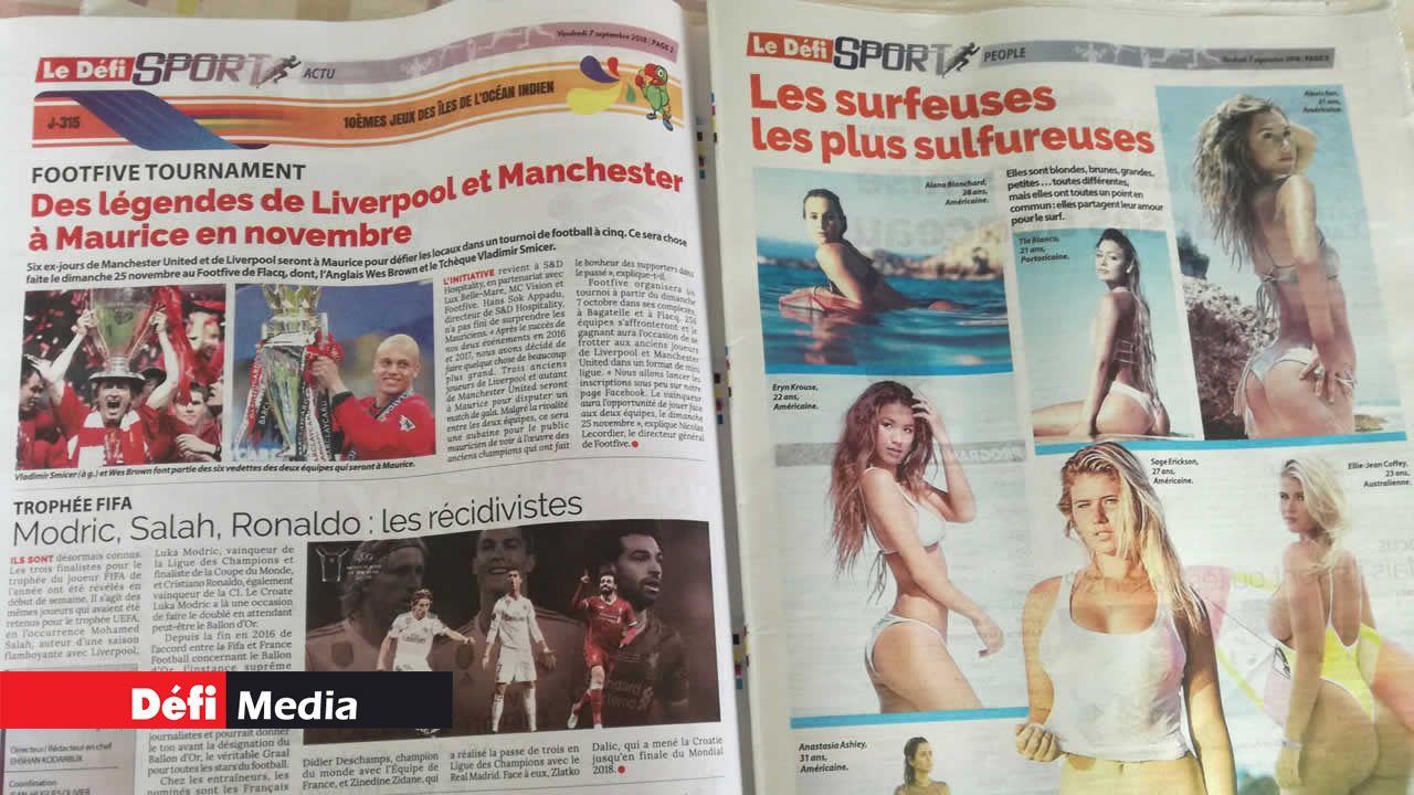 Les pages glamour sont consacrées à la basketteuse mauricienne Kelly Webb et aux sulfureuses surfeuses internationales. Le Maiden tient bien évidemment sa place avec un poster consacré à Enaad, qui a réalisé le doublé dimanche dernier. Le Défi Sport vous conseille aussi quoi manger et comment vous exercer. Sans oublier les portraits des stars d'hier, d'aujourd'hui et de demain : Ashita Beenessreesingh, Bennon Soobiah, Aslum et Moibeen Jeewa, Vilina Appiah, Lookman Moosun, Jonathan Charlot et Robert Chung. International : Rossi dans son jardin à San Marin et la rédemption de Tiger Woods en vue de la Ryder Cup.