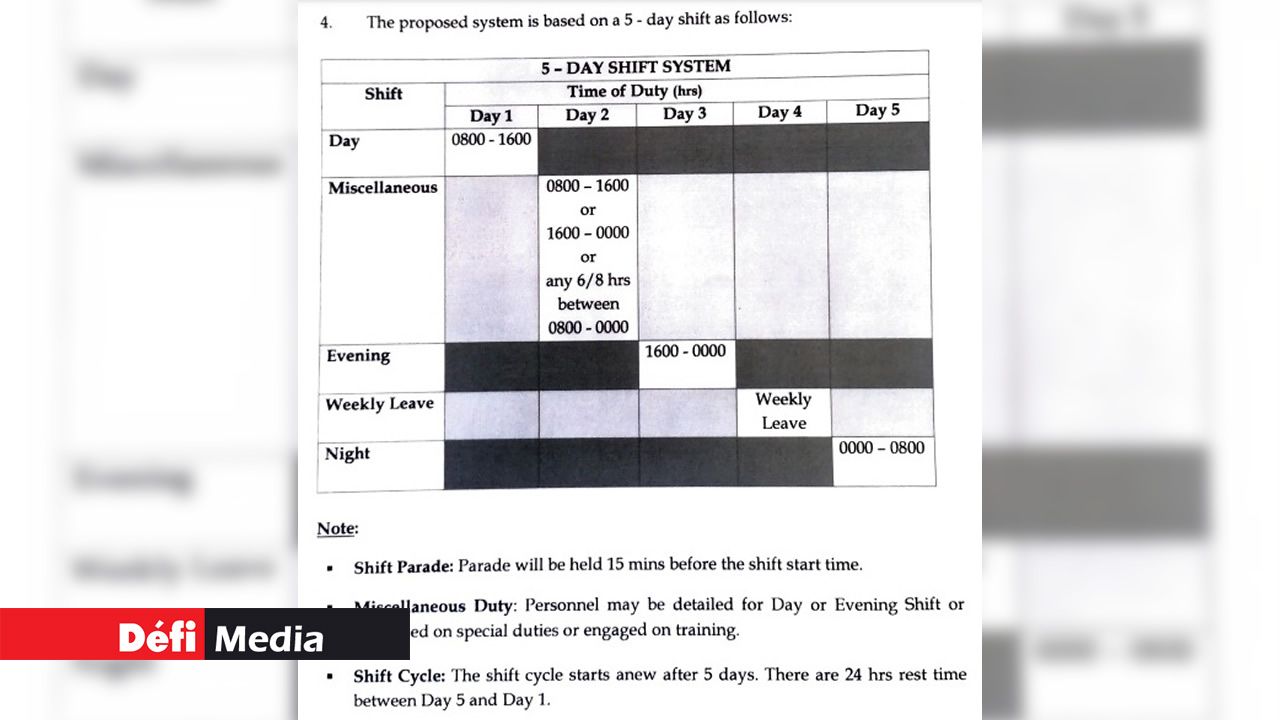 Sollicité pour une réaction, un haut gradé aux Casernes centrales laisse entendre qu’il s’agit d’un projet pilote et que des changements seront apportés, si besoin est. « Nous attendons d’obtenir les premiers retours des Divisional Commanders concernés. Quoi qu’il en soit, l’objectif est d’améliorer les conditions de service de nos policiers et qu’ils obtiennent suffisamment de temps pour récupérer afin qu’ils puissent être efficaces dans leur travail au quotidien », dit-il.