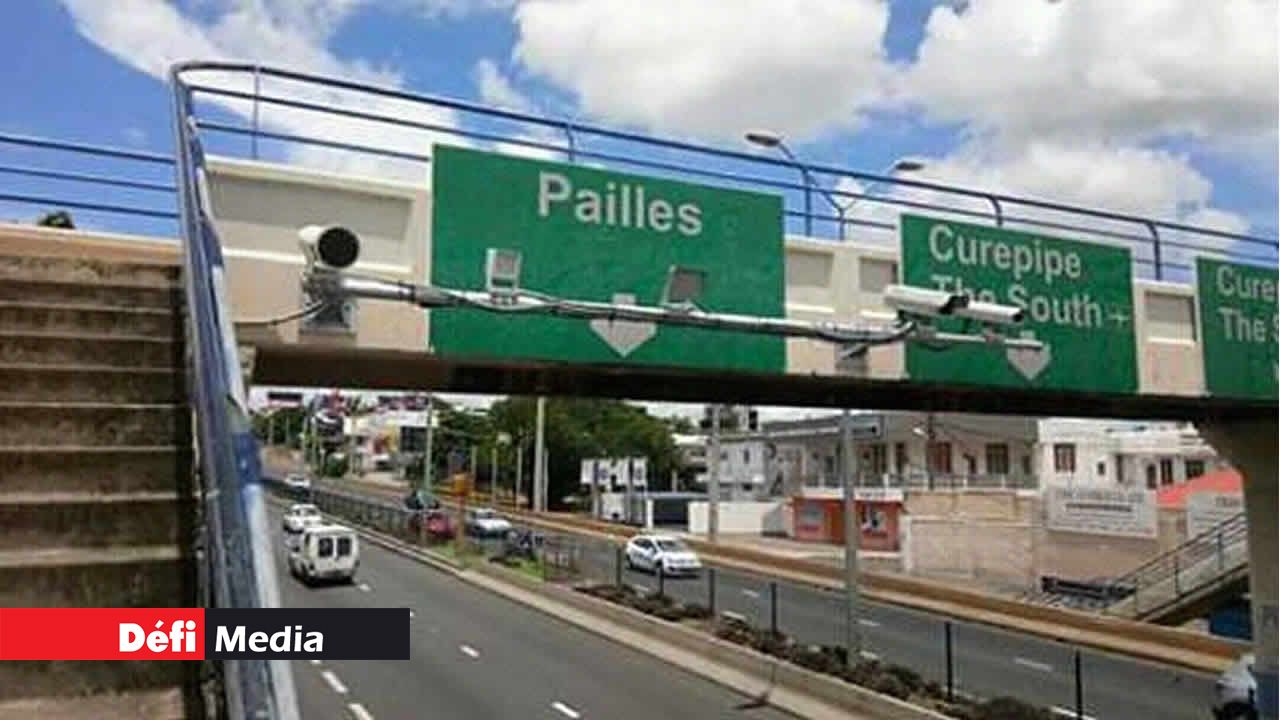 On y voit une rampe équipée de plusieurs caméras installées sur une passerelle et surplombant l’autoroute au niveau de Pailles en direction du Sud.