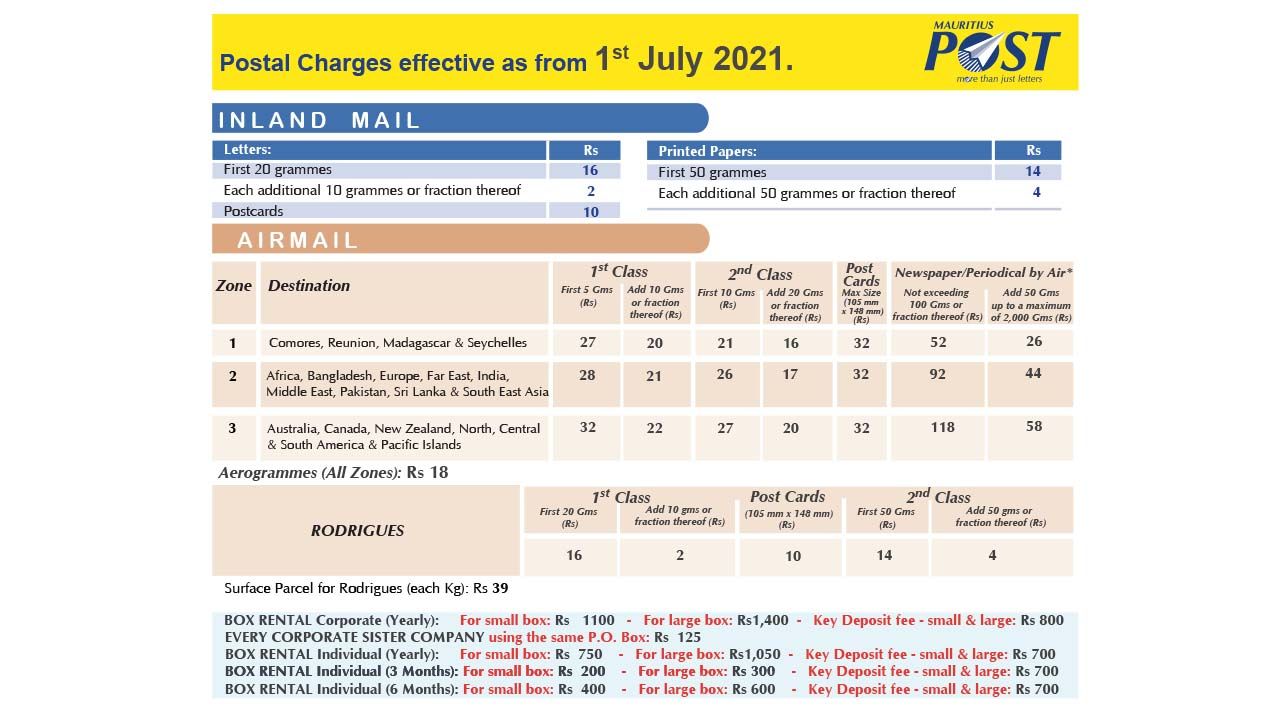 De nouveaux frais postaux entreront en vigueur à partir du jeudi 1er juillet 2021. Ils sont affichés nouveaux frais sur le site web de la Mauritius Post Ltd (MPL) depuis le lundi 28 juin 2021. Le tarif pour un Inland Mail coûtera désormais Rs 16 pour les 20 premiers grammes, contre Rs 13 auparavant. Une majoration de Rs 2 sera appliquée pour chaque surplus de 10 grammes.
