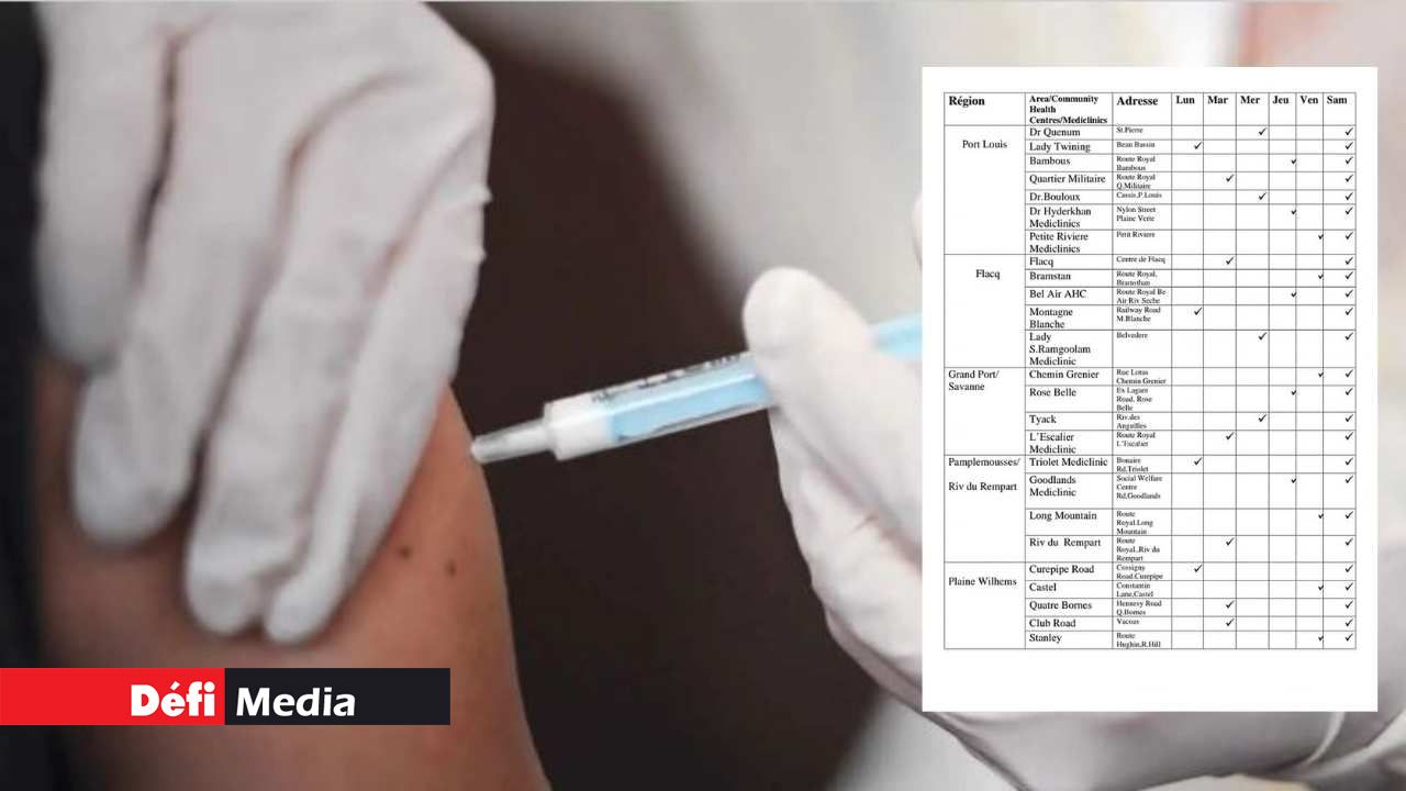 La vaccination se fera dans les Area Health Centres, Community Health Centres, Mediclinics et les hôpitaux régionaux à travers l'île de 9 h 00 à 15 heures en jours de semaine et jusqu’à 11 heures les samedis.