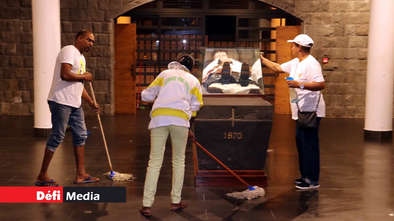 C’est vers 17h45, dimanche, que le caveau du Père Laval, à Sainte-Croix, a fermé ses portes. Les brancardiers sur place, aidés de quelques bénévoles, ont immédiatement procédé au balayage du sol et au nettoyage de la couverture vitrée du sarcophage. Des représentants du groupe Zezi Vre Zom ont ensuite aidé à démonter la structure métallisée à l’intérieur du caveau. Les pompiers, qui étaient non loin, n’ont pas tardé à nettoyer l’espace à grande eau. Pendant ce temps, la foule de fidèles qui assistait à la dernière messe du dimanche après-midi se dissipait graduellement. Le portail principal de la zone a été fermé au public vers 18h30. La police régulière a ensuite pris possession de l’espace.