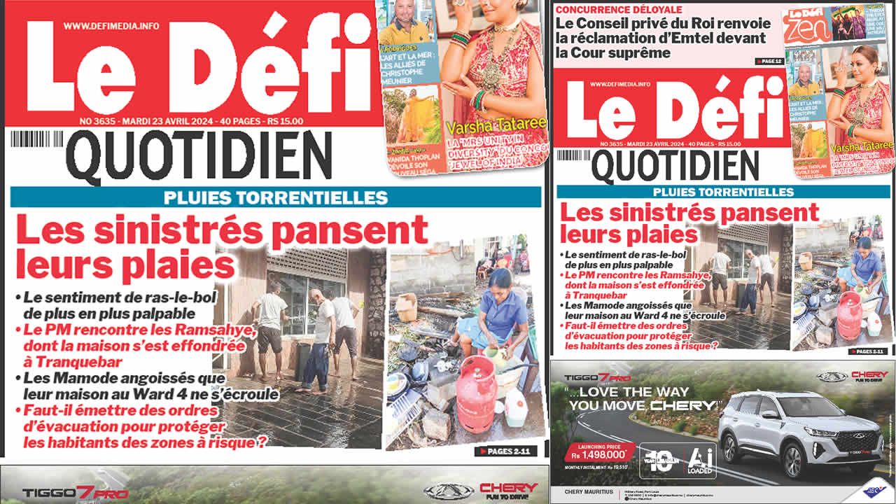 ? Voici la Une du Défi Quotidien. Le journal est en vente à Rs 15 l'exemplaire aux endroits habituels (supermarchés, boutiques, tabagies, superettes). Bonne lecture !