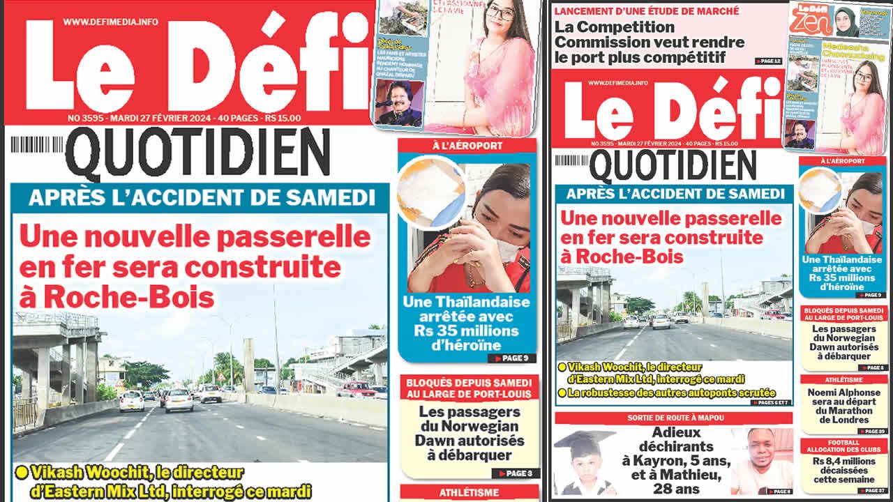 ? Voici la Une du Défi Quotidien. Le journal est en vente à Rs 15 l'exemplaire aux endroits habituels (supermarchés, boutiques, tabagies, superettes). Bonne lecture !